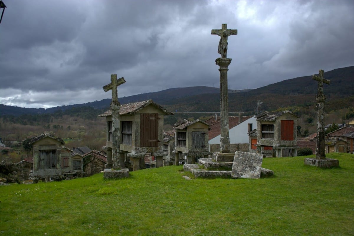 Los hórreos de Eira Grande están a pocos metros de la iglesia y se encuentran rodeados por casas tradicionales de piedra, muchas de ellas rehabilitadas y adornadas con flores, cruceiros y varias fuentes.