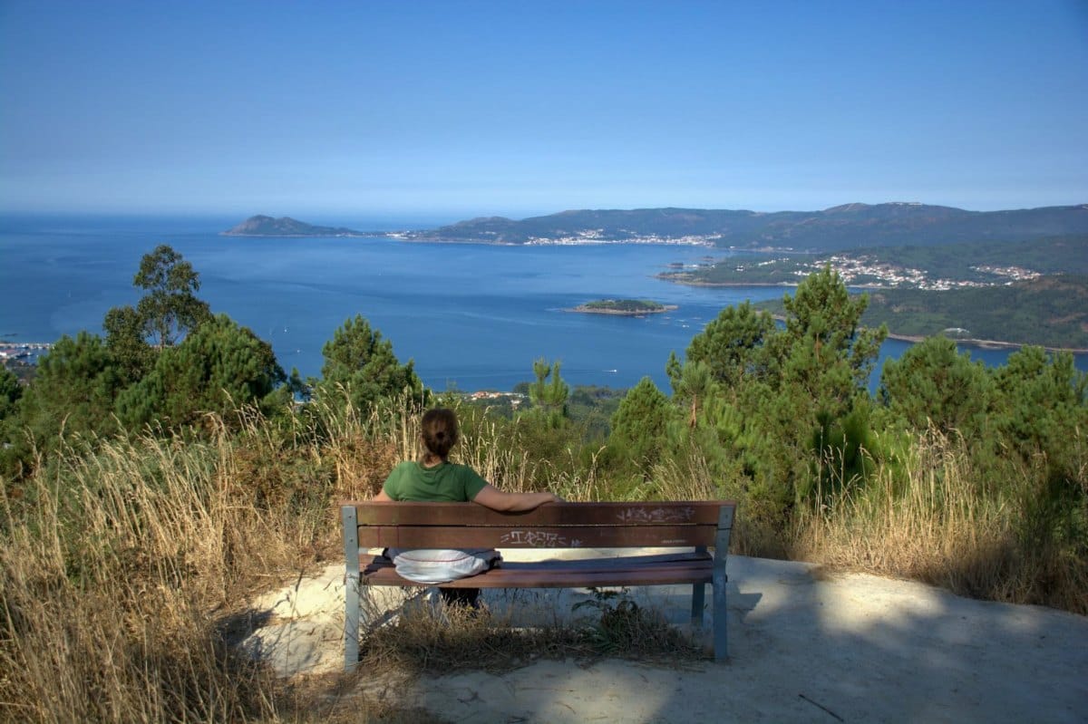 Después de dos kilómetros alcanzamos el poste geodésico de Monte San Lois, las antenas, y unos metros más abajo el banco, que tiene las mejores vistas de la ría, y también los mejores atardeceres.