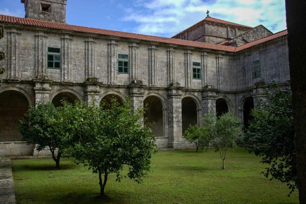 Alcanzamos el monasterio, y nos vamos a visitar su bonito claustro, que puede verse de forma libre, aunque si quieres una visita guiada puedes concertarla llamando a la Oficina de Turismo Rías Baixas.