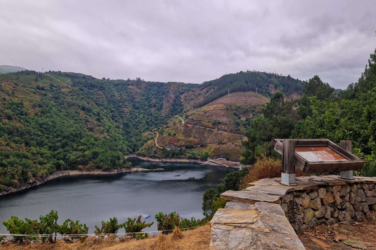 Seguimos descendiendo entre pinos y más adelante comenzamos a ver los hermosos viñedos, alcanzamos el mirador do Xábrega, situado en un montículo con vistas al embalse de Santo Estevo.