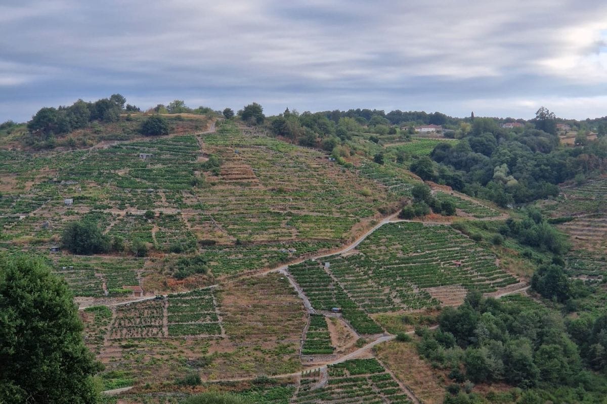 Caminamos un pequeño tramo por carretera hasta el desvío que está al pasar la aldea de Souto Novo, el camino te adentra hacia el bosque y a la derecha podemos ver los extensos y famosos viñedos en escalera de A Ribeira Sacra.